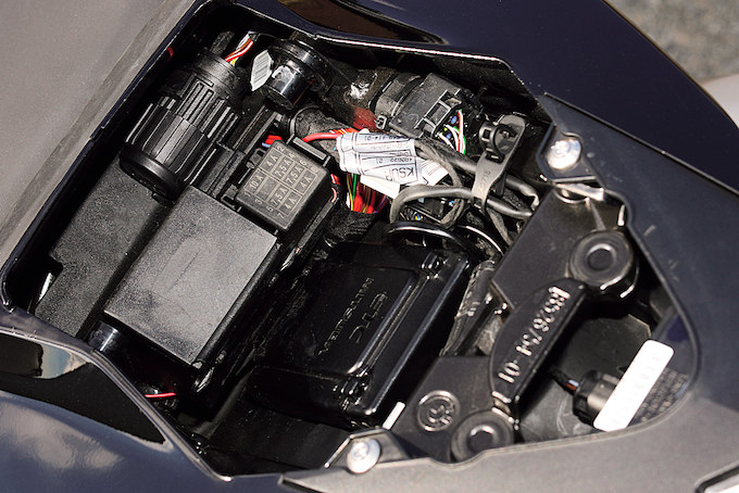 タンデムシートに収納式のラゲッジループを装備するが、積載性は悪い。シート下の小物入れもETC車載機が入る程度。車載工具は(+)(-)ドライバーとT25ヘックスローブレンチのみ。カウル類の脱着はかなりの部分まで可能だが、メンテナンスには別途工具が必要だ。