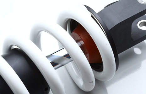 スプリングのプリロードは、ナット調整式で無段階でのプリロード調整が可能。今回紹介しているのはプロトタイプのため、製品版とはスプリングのカラーが異なる。製品版ではオレンジのスプリングが使用されている。圧側のダンピングは、高速側と低速側がそれぞれ独立して調整可能。より精密なセッティングを実現する。ボディは高剛性なアルミ鍛造。ショックユニット自体に高い剛性を持たせているのもアラゴスタの特徴のひとつ。