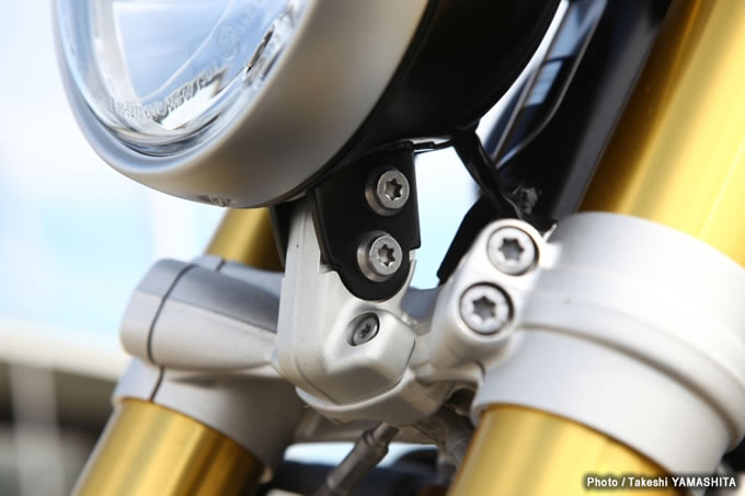 R nineT 独自の構造を持つフレームにセットされるフロントサスペンションは、BMW ボクサーの常套手段であるテレレバーではなく、コンベンショナルなテレスコピックフォークだ。R 1100 以降のボクサーでテレスコが採用されたのは HP2 Enduro、HP2 Megamoto に続いて3台目となる。どちらも採用の理由がスポーツ性を重視した軽量化にあるのに対し、R nineT の場合はカスタムビルダーがその自由な発想を生かすためという点で画期的だ。ちなみに、46mm 径という極太なテレスコピックのチューブは S 1000 R と同一部品だが、内部構造が異なるため、調整機構はない。