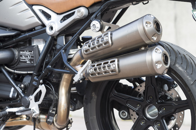 そしてRナインティ スクランブラーの外観を特徴づけているのが車体左側に配置されるアップタイプの2本出しマフラーだ。Rナインティ スクランブラーの特徴の大きなひとつであるアップマフラーは凝った意匠のサイレンサーが装着されおり、このモデルの魅力となっている。