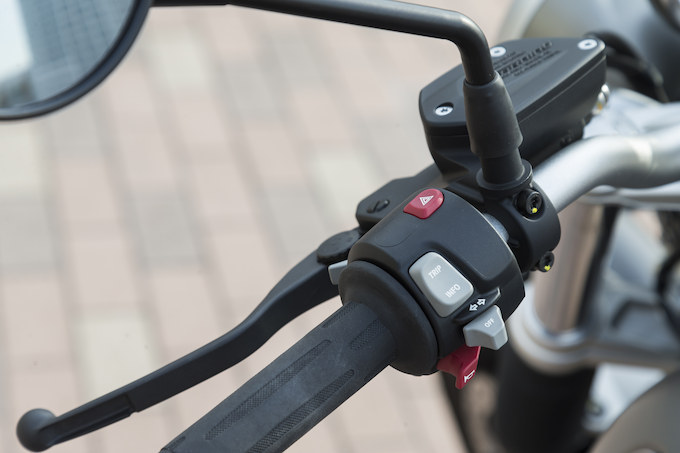 外装パーツではメーターが簡略化され、液晶モニターを備えたスピードメーターのみとなり、シートはブラウン地のタックロールシートが装着される。タンクはアルミからスチール(鉄)へと変更され、容量は1L少ない17Lとなった。細かいところではヘッドライトのバルブがH7からH4に変更され、発電容量は600Wから720Wへと向上している。グリップヒーターは標準装備だ。