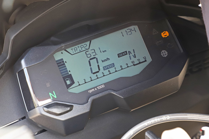 メーターはフル液晶で、時計やギアポジションなども表示する多機能タイプ。各種警告灯などのインジケーターはパネルの左右に配されている。