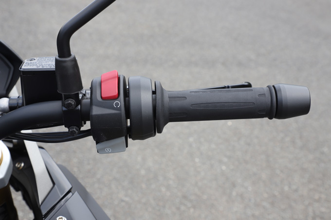 右側のハンドルにはスターターボタンとキルスイッチのみ。ハザードはぜひ装備してもらいたい。