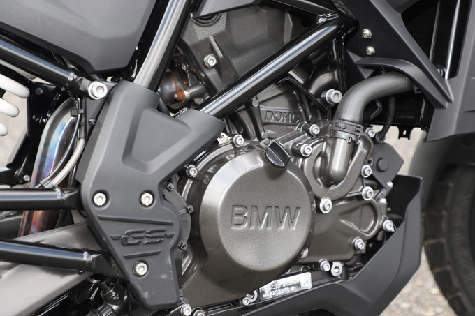 G310GSを目の前にすると、かなり大柄なボディで迫力がある。特に前輪からタンクにかけての車体前部にボリューム感があり、堂々とした外観となっている。幅が広めで少し手前にセットされたハンドルバーは、オフロードマシンほど高くはないが、立ち気味で余裕のあるライディングポジションを実現している。シート高は835mmとそれほど低いわけではないが、単気筒エンジンで車両重量が175kgということもあり、大型のGSシリーズに比べれば、気負わずに乗ることができる。