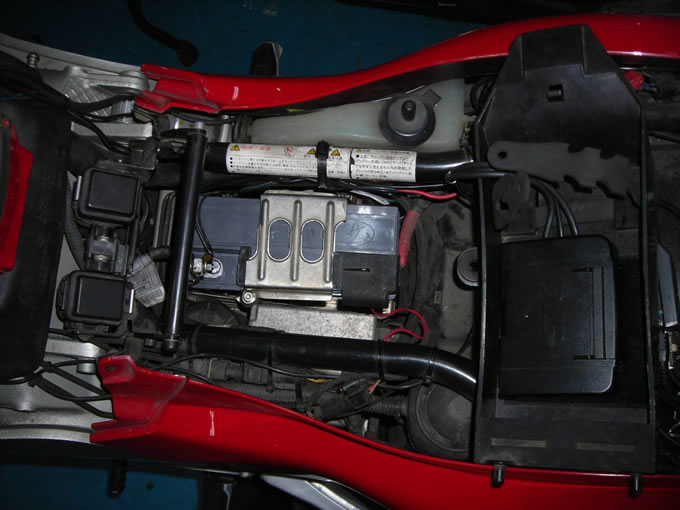 K1200RSには19AのMF式バッテリーが使用されていて、840Wという四輪車並のオルタネーター(発電機)が装備されています。インジェクション、ABS、グリップヒーター、シートヒーター、常時点灯ヘッドライトを同時に使っていても問題はありません。ただし、ABS2、インテグラルABS共に自己診断する時の要求電圧の設定が高く、セルモーターが普通に回る位の状態でもABSは電圧が低いと判断してエラーを起こすことがあります。インテグラルABSはエラーを起こすと通常の制動が得られないので、車輌の使用状況とバッテリーの使用期間を考えて早めに交換することが大切です。バッテリーの状態は目に見えませんので、確実にテストし、十分に使用できることを確認してもらってください。