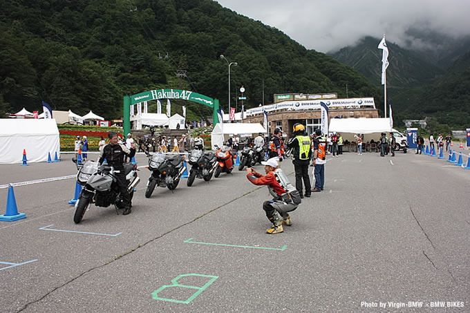 02続々と山を登ってくるBMWバイクたち。右手には大自然が育む清流、そして左手に『Hakuba 47』のアーケードと、BMW Motorradのロゴが目に飛び込んでくる。参加者にとっては目的地に到着してホッとする瞬間だ。昨晩の豪雨では川のようになっていた道も、今朝はすっかりドライコンディション。