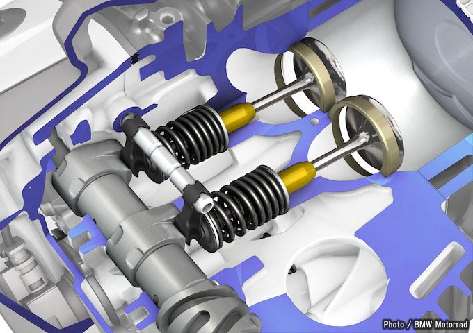 BMW ShiftCam(以下シフトカム)と名付けられたこのシステムは、吸気カムに低負荷低・中回転用カム、高負荷・中高回転用カムの2種類のカム山を持たせ、ライダーのアクセル操作や、5,000rpmを境に、ローカムとハイカムが切り替わるというもの。気になるその可変方法は、カムシャフトの一端に可変用ガイド溝があり(この溝はシフトドラムの溝に似た構造だ)、そこにアクチュエーターにより駆動されるピンが出てくることで適宜可変するというもの。ピストン位置としては圧縮上死点時にカムが横にスライドし、それを可能にしているのだ。